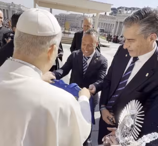 El papa León XIV recibe la camiseta del Real Oviedo de manos del capitan del equipo, Santi Cazorla, en la Plaza de San Pedro. - REAL OVIEDO