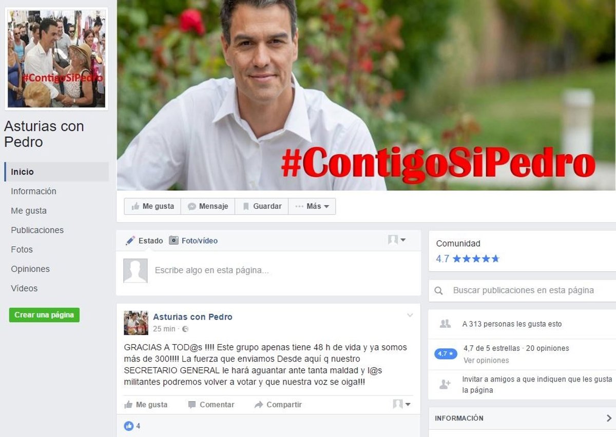 Un grupo de unos 300 asturianos se han unido en las redes sociales para impulsar una plataforma de apoyo al secretario general del PSOE, Pedro Sánchez, "el primer Secretario General elegido en Primarias". Los partidarios de la continuidad del cuestionado líder socialista se han aglutinado bajo los títulos 'Asturias con Pedro' en Facebook y '#ContigoSiPedro' en Twitter.