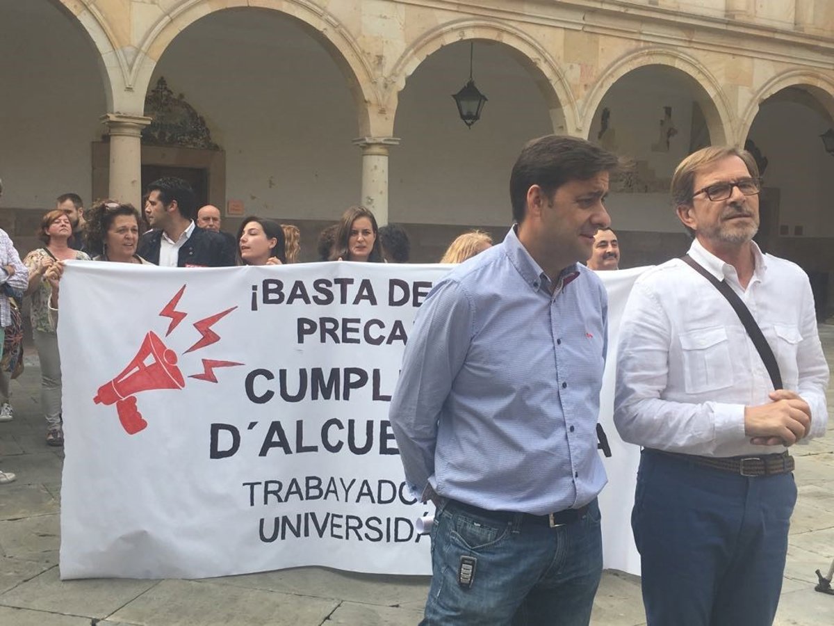 Representantes de la Junta de Personal Funcionario no Docente; el Comité de Empresa de Personal Laboral de la Universidad de Oviedo, los sindicatos con representación en dichos órganos y la Asamblea de Personal de Administración y Servicios laboral y funcionario, se han concentrado este jueves en el patio del Edificio Histórico para reclamar al Rectorado que se cumplan los acuerdos con el Personal de Administración y Servicios (PAS) para recuperar derechos laborales.