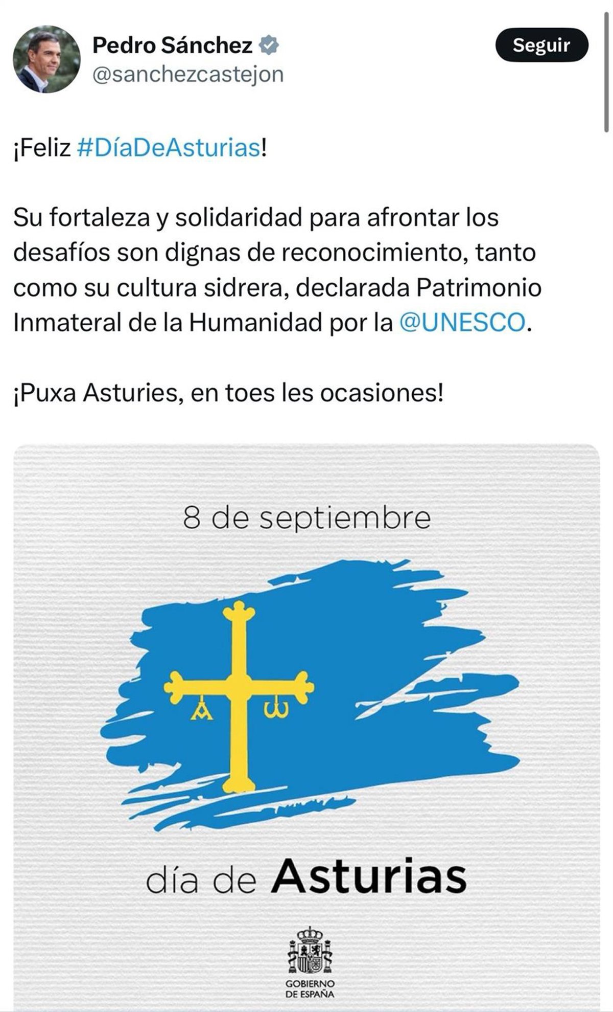 "¡Feliz #DíaDeAsturias!", ha escrito el jefe del Ejecutivo, quien ha subrayado que "su fortaleza y solidaridad para afrontar los desafíos son dignas de reconocimiento, tanto como su cultura sidrera, declarada Patrimonio Inmaterial de la Humanidad por la @UNESCO".