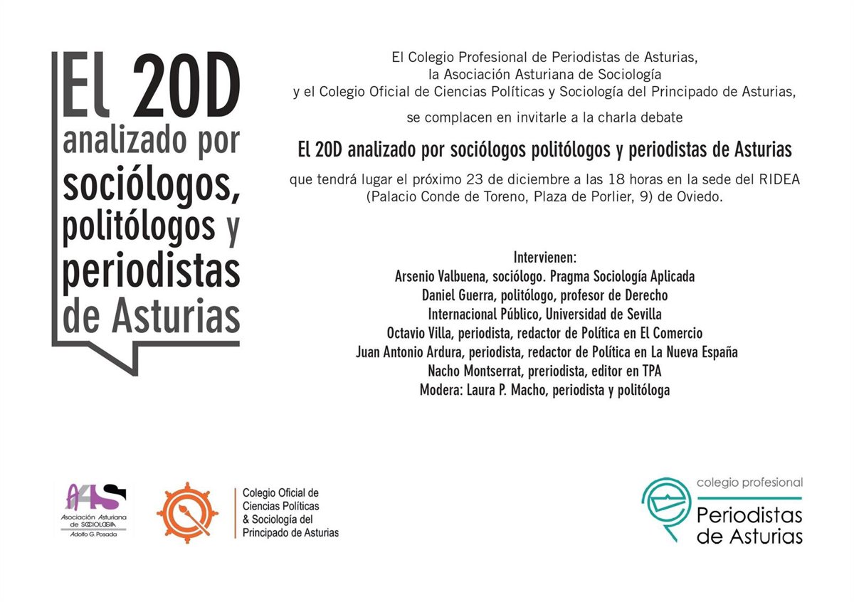 El Colegio Profesional del Periodistas de Asturias y el Colegio Oficial de Ciencias Políticas y Sociología del Principado de Asturias organizan este miércoles, 23 de diciembre, una charla en la que profesionales de ambas entidades analizarán los resultados de las Elecciones Generales del 20 de diciembre y el escenario político posterior.