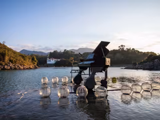 La pianista y cantante Violette Prevost, el actor y músico Mehdi Meskini y el trompetista y hombre rana Clément Béguet, actuarán en un cuarto de piano de cola, el primer piano flotante ideado por la compañía, una pieza de museo que equilibra su flotación sobre 16 vasijas de cristal.