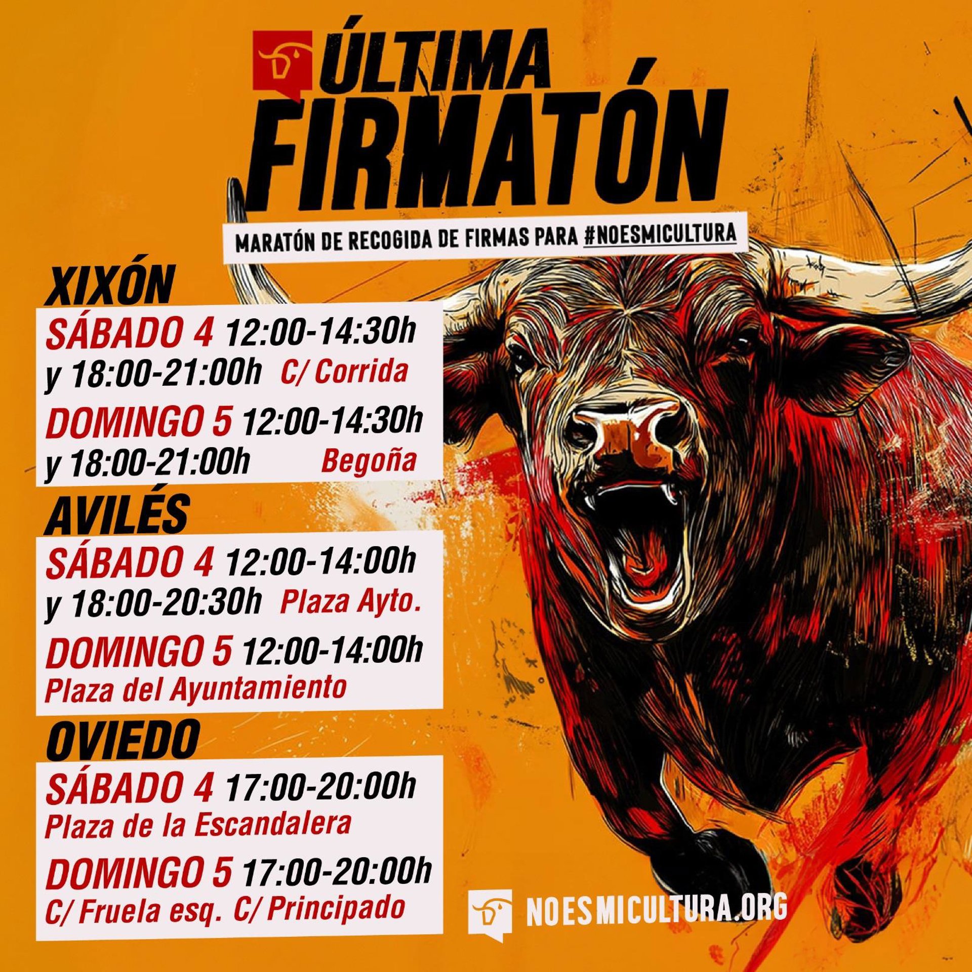 La Plataforma Asturies Antitaurina celebra este fin de semana el último maratón de recogida de firmas a favor de la iniciativa ciudadana "No es mi cultura" para derogar la Ley 18/2013 de 12 de noviembre que regula la tauromaquia como Patrimonio Cultural y restringe las competencias autonómicas en materia de cultura y espectáculos públicos.