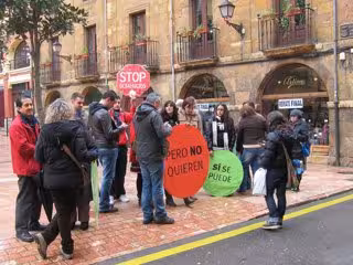 Un grupo de personas convocadas por la Plataforma de Afectados por las Hipotecas se ha concentrado este sábado a las puertas de la sede de la Procuradora General, donde se celebra la asamblea extraordinaria de la Federación Asturiana de Concejos (FACC).