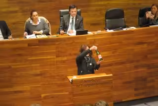 "Esperamos que esto no se produzca", ha dicho mientras enseñaba la botella a los parlamentarios del PSOE. Con ese gesto ha pretendido demostrar las consecuencias que tendría el acuerdo para productores asturianos.