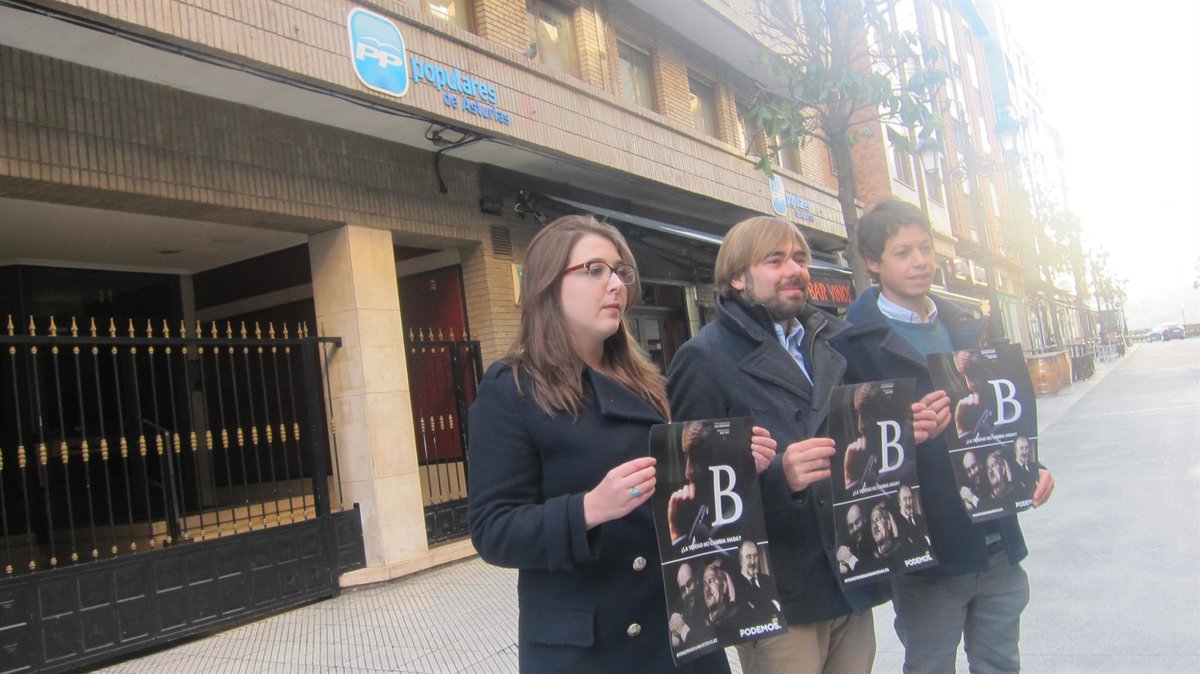 El diputado de Podemos en la Junta General, Daniel Ripa, y los candidatos electorales Segundo González (Congreso) y Jara González (Senado) han presentado este ciclo de proyecciones ante la sede del PP de Asturias.