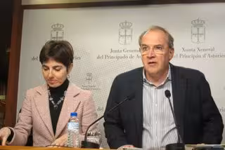 Cuervas-Mons ha ofrecido una rueda de prensa en la JGPA, acompañado de su compañera Emma Ramos, en relación al anuncio de subasta publicado en el Boletín Oficial del Principado de Asturias en el que se establece el precio de las acciones del Principado (un 40 por ciento) en un mínimo de 3,3 millones.