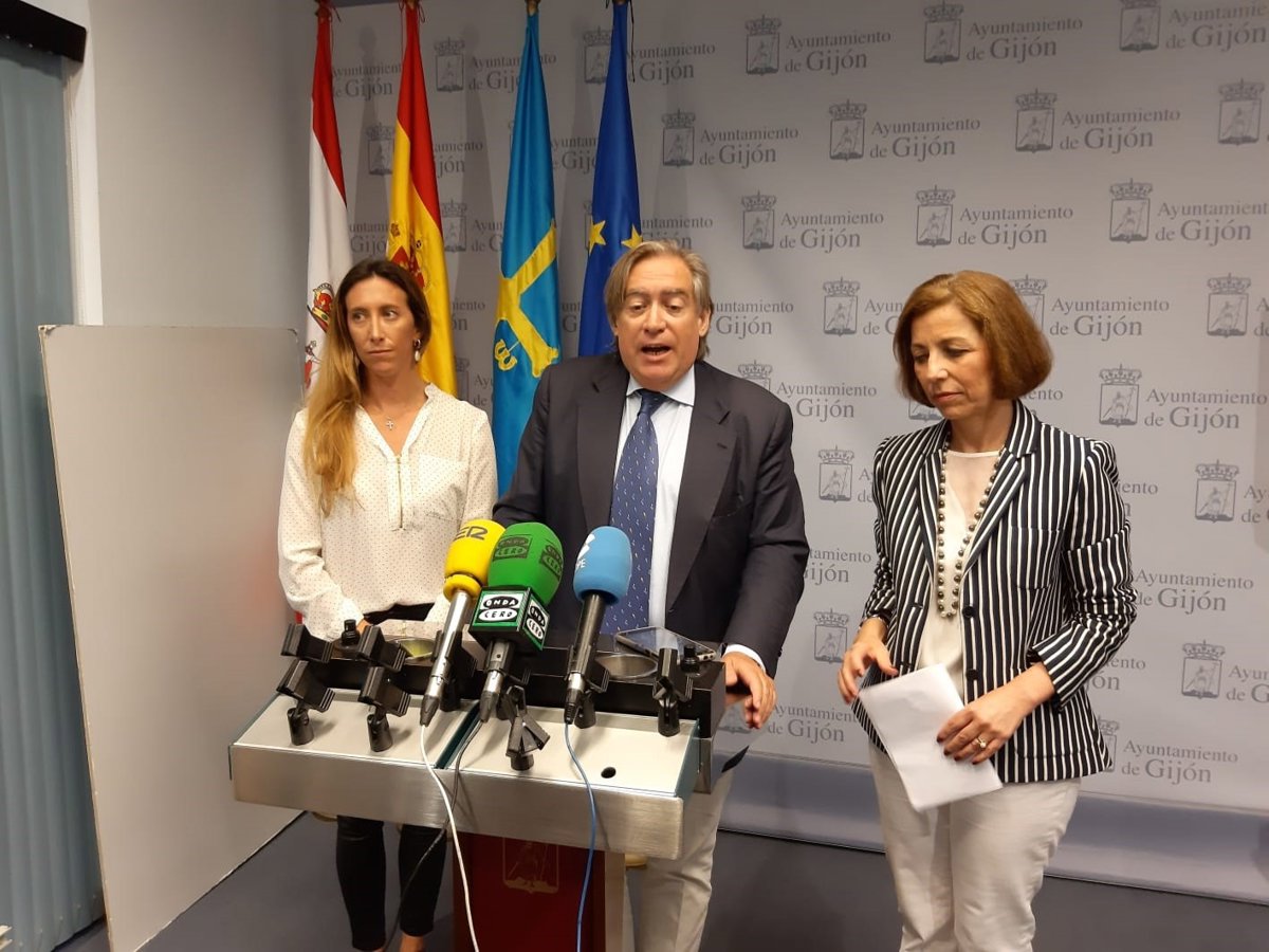 El portavoz del PP en el Ayuntamiento de Gijón, Alberto López-Asenjo, en rueda de prensa junto a las dos ediles 'populares', Ángela Pumariega y Ángeles Fernández-Ahúja - EUROPA PRESS