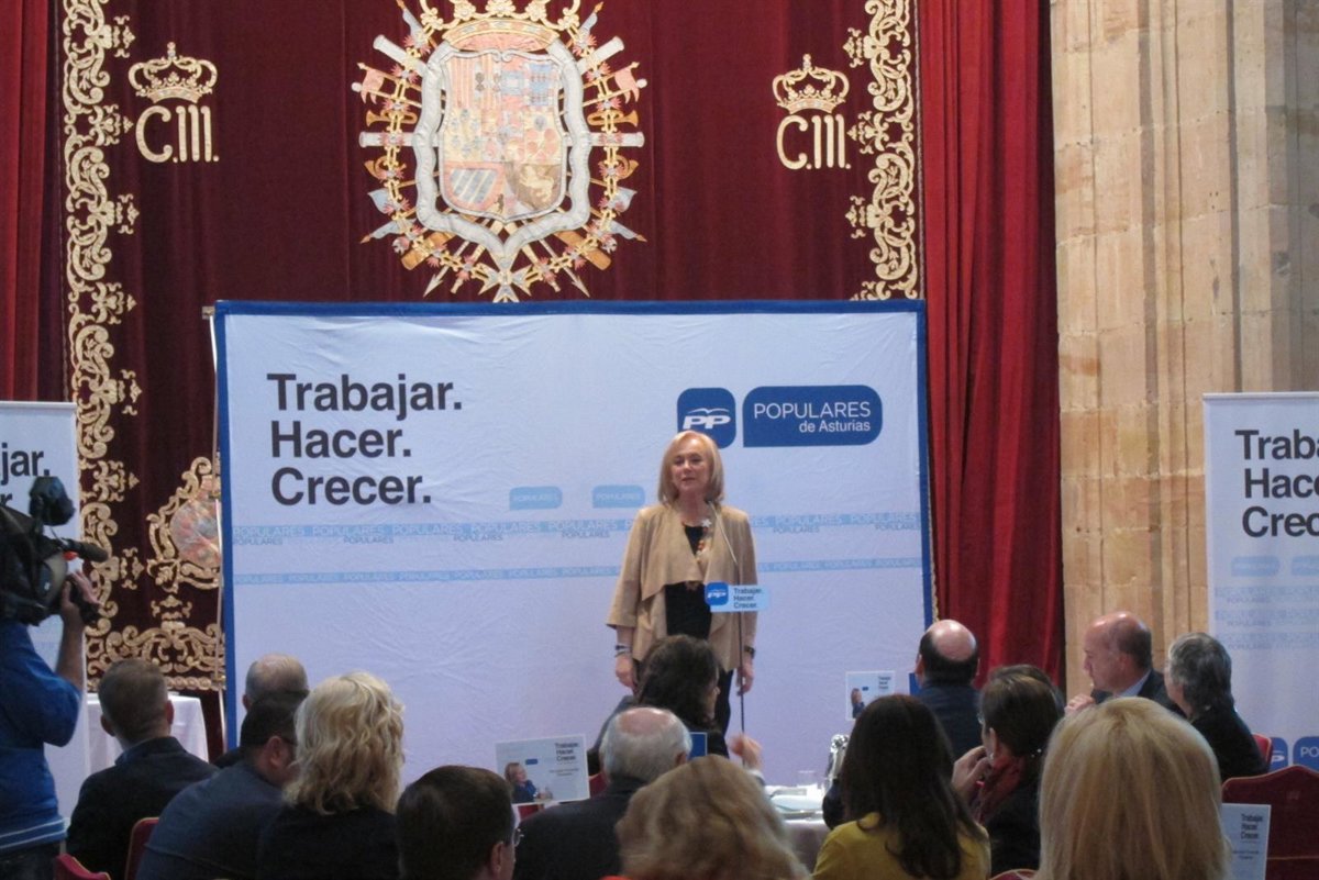 La presidenta del PP de Asturias, Mercedes Fernández, ha presentado este viernes el programa electoral de su partido en Asturias, en el marco de un desayuno de trabajo con los principales líderes 'populares' asturianos y que ha estado abierto a los medios de comunicación. La dirigente del PP ha ido desgranando las diferentes propuestas, expuestas en pantallas en un salón del Hotel de la Reconquista, en Oviedo.