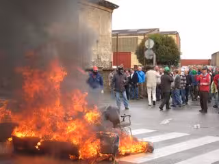 El Colectivo de Prejubilados de Naval Gijón han cortado el tráfico este martes con una barricada tras entrar por la fuerza en el astillero, sacar parte del mobiliario, y prenderle fuego en la calle. Algunos manifestantes se han encerrado en las Instalaciones, según ha informado el sindicato CSI.