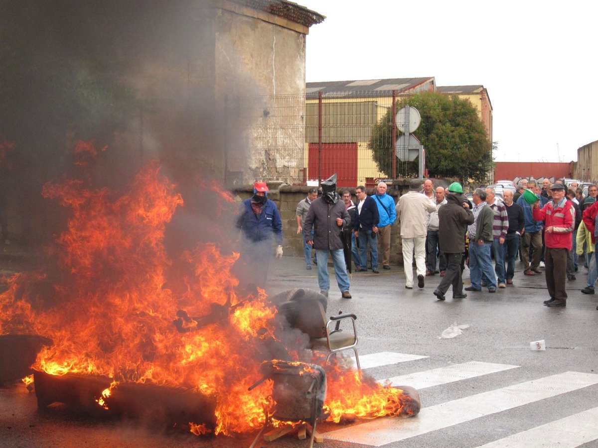 El Colectivo de Prejubilados de Naval Gijón han cortado el tráfico este martes, en la confluencia de la calle de Mariano Pola y la plaza de Padre Máximo González, con una barricada tras entrar por la fuerza en el astillero, sacar parte del mobiliario, y prenderle fuego en la calle.
