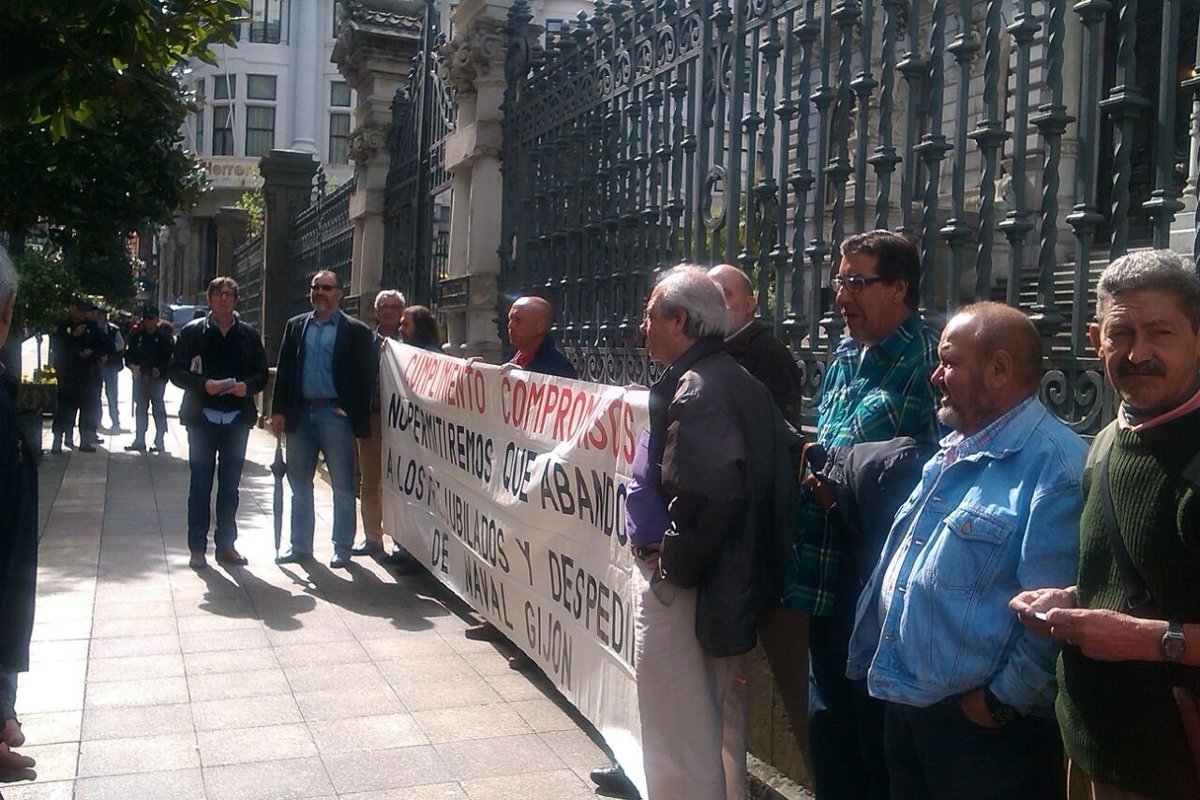 Los manifestantes estuvieron concentrados frente al edificio de la Junta General del Principado de Asturias entre las 11.45 y las 12.45 horas, aproximadamente, a donde llevaron una gran pancarta en la que se podía leer: 'Cumplimiento compromisos: No permitiremos que abandonéis a los prejubilados y despedidos de Naval Gijón'.