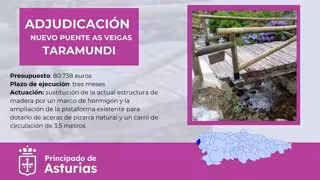 La Consejería de Fomento, Cooperación Local y Prevención del Gobierno asturiano ha adjudicado a la empresa Excavaciones Quintela SL las obras del nuevo puente sobre el río Turia para acceder al pueblo de As Veigas, en el concejo de Taramundi, por un importe de 80.738 euros. El plazo de ejecución previsto es de tres meses.
