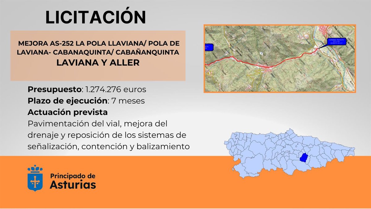 OVIEDO 26 Jun. (EUROPA PRESS) - El Gobierno de Asturias ha licitado las obras de mejora de la carretera AS-252 (Pola Llaviana/ Pola de Laviana y Cabanaquinta/Cabañaquinta), a su paso por el concejo de Laviana, en un precio máximo de 1.274.276 euros. La actuación cuenta con un plazo de ejecución de 7 meses y las empresas interesadas pueden presentar sus ofertas hasta el próximo 23 de julio.