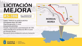 El Gobierno de Asturias ha iniciado la licitación de las obras de mejora de la carretera AS-386 (Ujo-Cabanaquinta) a su paso por la localidad de Moreda, en el concejo de Aller. Dotada con un presupuesto base de 267.682 euros y un plazo de ejecución de dos meses, la actuación se centrará en la renovación de 1.300 metros lineales de recorrido urbano, ubicados entre los puntos kilométricos 4,9 y 6,2.