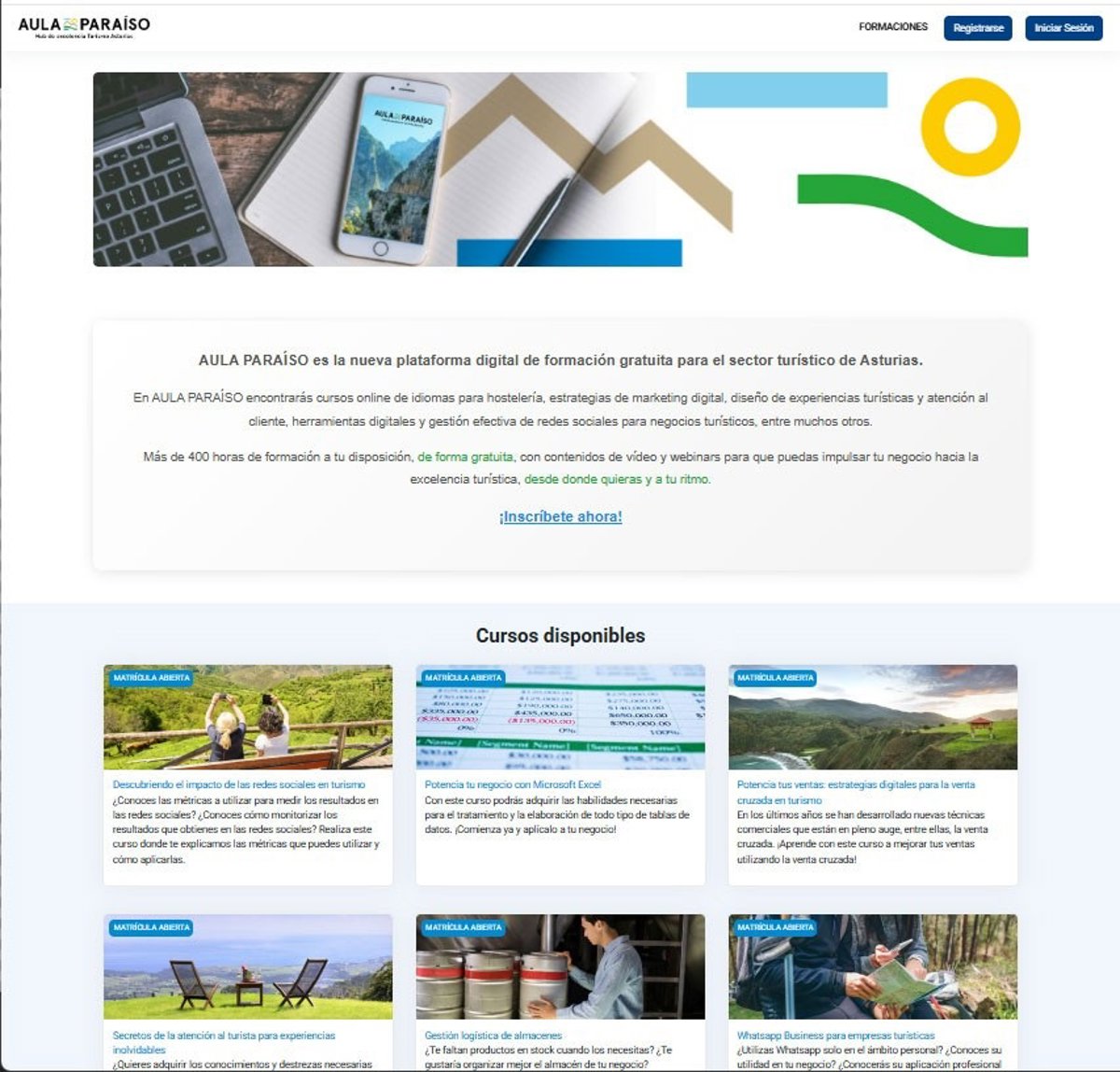 Aula Paraíso (www.aulaparaiso.pro) es una plataforma de teleformación en la que se alojan vídeos, webinarios, talleres prácticos y clases magistrales. A través de este sistema, el personal vinculado al sector turístico puede inscribirse y realizar los diferentes cursos con total flexibilidad horaria y desde cualquier punto de Asturias. De este modo, se solventa uno de los principales problemas a los que se enfrentan los profesionales para continuar con su formación.