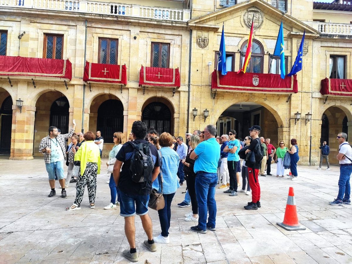 Archivo - Un grupo de turistas escucha las explicaciones de un guía en la Plaza de la Constitución, con el Ayuntamiento de Oviedo al fondo. - EUROPA PRESS - Archivo