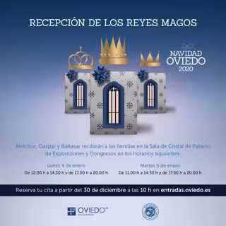 El Ayuntamiento de Oviedo, a través de la Concejalía de Festejos, y ante la prohibición dictada por el Gobierno de Asturias de celebrar cabalgatas de Reyes, ha organizado, cumpliendo con los protocolos sanitarios de la Consejería de Salud, varias recepciones para que los niños ovetenses puedan saludar a Sus Majestades los Reyes Magos de Oriente.