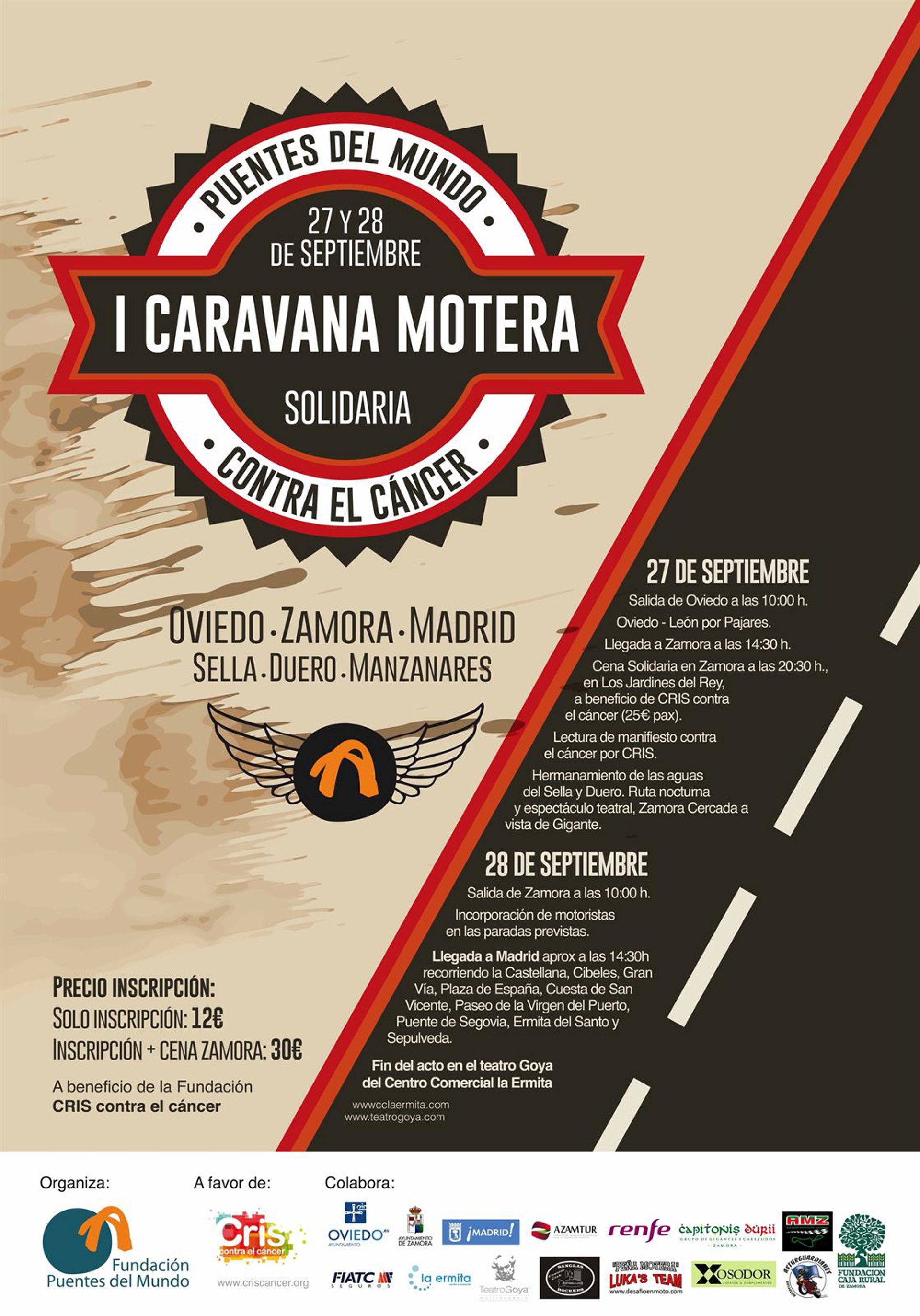 La Fundación Puentes del Mundo ha organizado la I Caravana Motera contra el Cáncer los días 27 y 28 de septiembre de 2014 con un recorrido de Oviedo-Zamora-Madrid, en colaboración con los Ayuntamientos de Oviedo, Zamora y Madrid, y los clubs moteros Asturguardianes, Lukas Team, de Ribadesella, AMZ de Zamora y Sanglas Rockers de Madrid.