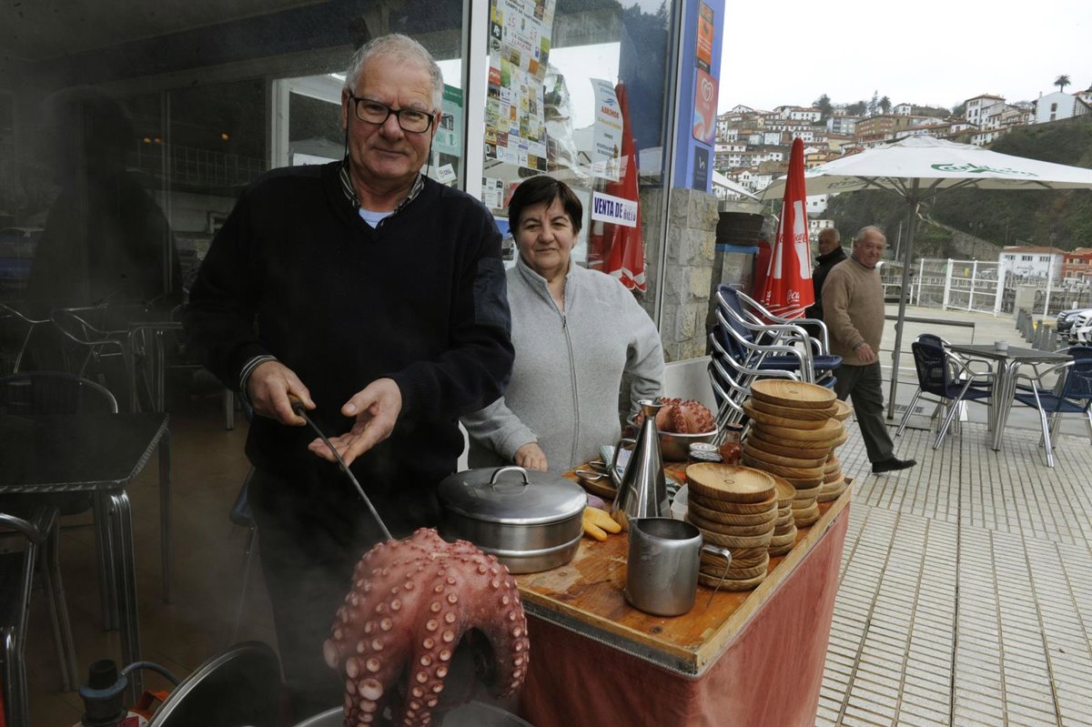 "Desde pequeño salió a pescar pulpo y luego lo preparaba para vender, y está a punto de jubilarse", y siguen acudiendo los dos a sus citas periódicas en Lastres (Colunga), Villaviciosa y Posada de Llanes (Llanes), todos en Asturias. Luego vuelven a casa y trabajan en ferias habituales en la costa cercana a Vigo, y así cada semana.