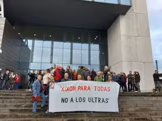 Previo al juicio, un grupo de personas se concentró a las puertas del Palacio de Justicia con una gran pancarta en la que se podía leer 'Xixón para todas. No a los ultras'.