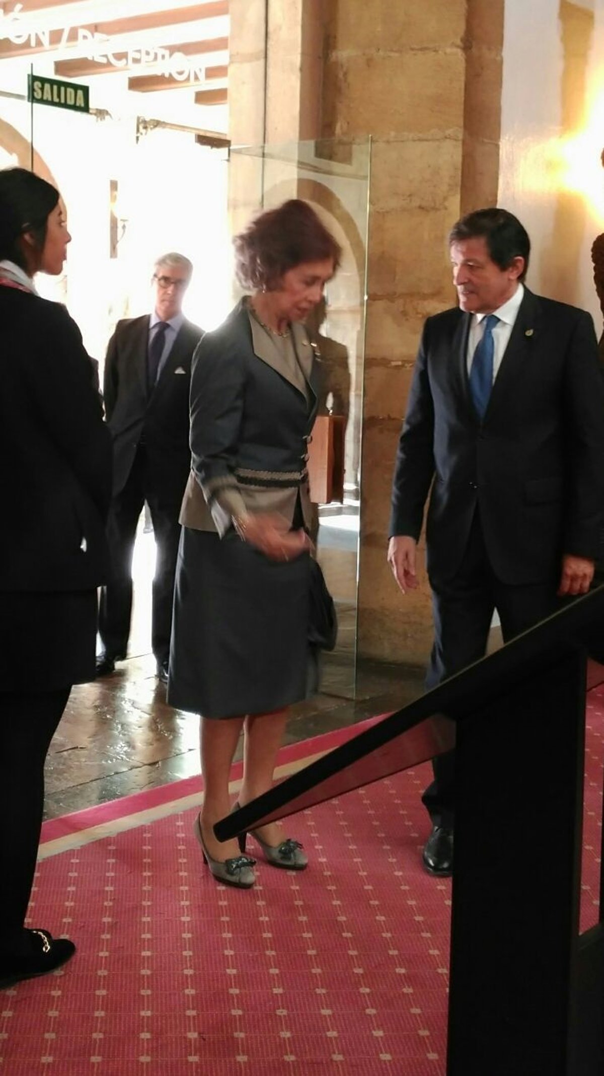 El presidente de Principado, Javier Fernández, recibió a doña Sofía a las puertas del hotel, donde permanecerá hasta el comienzo de la ceremonia de entrega.