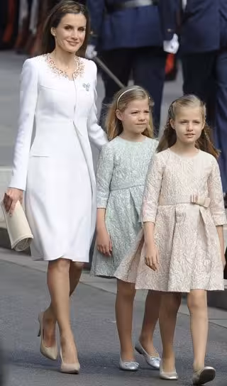 Leonor y Sofía lucían vestidos iguales de brocado, aunque de distinto color. La Princesa de Asturias, de Girona y Viana de color rosa pálido y la infanta Sofía en verde agua. Los modelos de las pequeñas, que llevaban el pelo suelto, eran de talle alto, lazo a la cintura, manga francesa y falda tableada de vuelo.