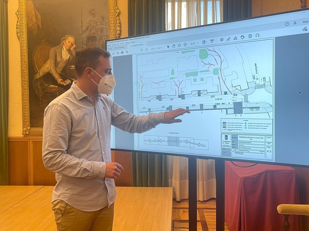 El concejal de Obras Públicas y Proyectos de Ciudad del Ayuntamiento de Gijón, Olmo Ron, ha presentado este miércoles las obras de remodelación de la calle Río Eo, que con un presupuesto de unos 2,4 millones de euros y nueve meses de plazo de ejecución, supondrán un cambio completo del vial que une la carretera de Oviedo con la carretera Carbonera.