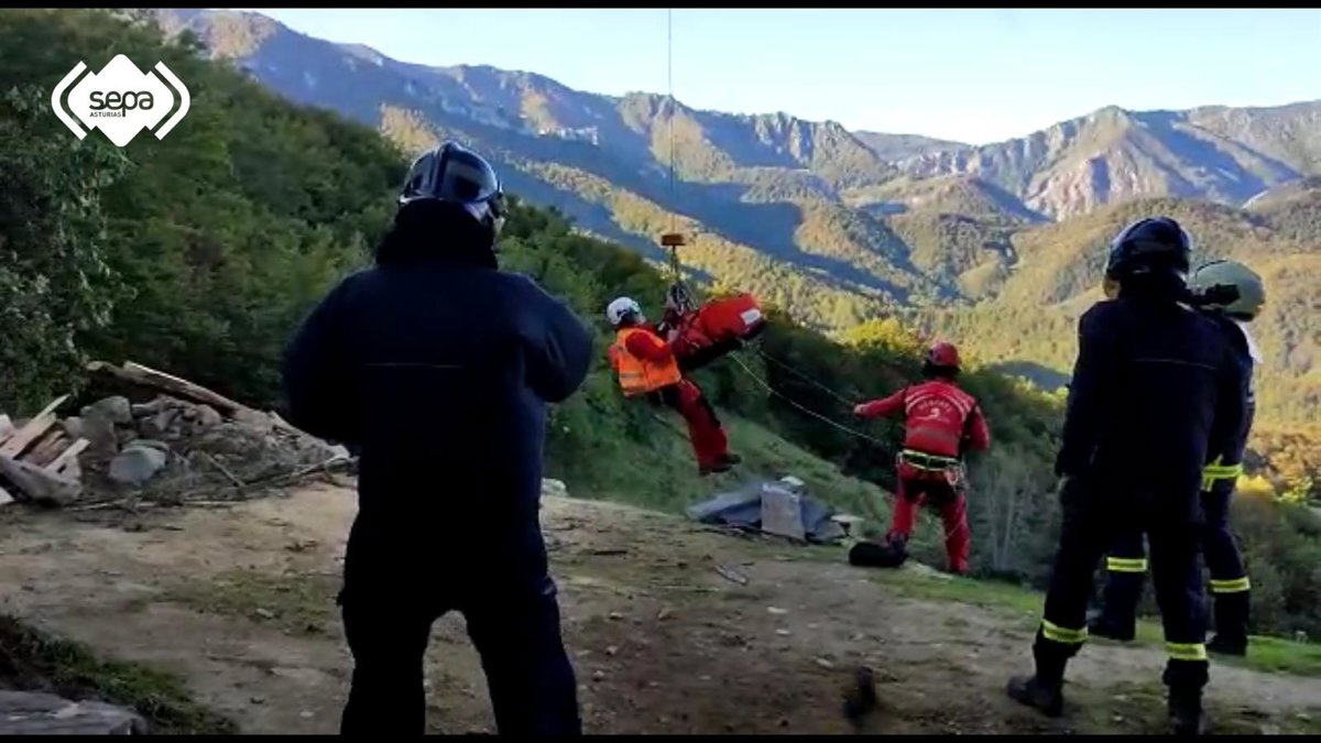 El Grupo de Rescate de Bomberos del Servicio de Emergencias del Principado de Asturias (SEPA), a bordo del helicóptero medicalizado, ha trasladado al Hospital Universitario Central de Asturias (HUCA), en Oviedo, a una mujer que resultó herida tras sufrir una caída en el interior de una cabaña en La Felguerina, Caso.