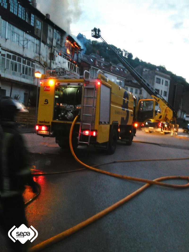 El afectado fue atendido por el equipo sanitario desplazado al lugar y fue dado de alta in situ. Los bomberos aun trabajan en las labores de extinción del edificio deshabitado, de tres plantas, ubicado en el barrio de Sotiello, en la calle Marqués de Comillas 3, en Moreda, Aller.
