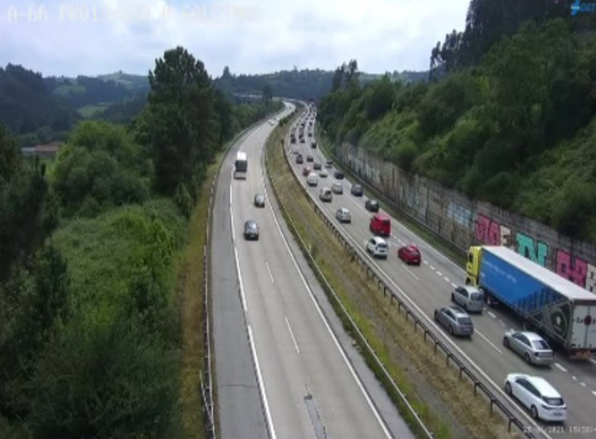 Numerosos usuarios están sufriendo las consecuencias este viernes de un aparatoso atasco en la autovía A-66, conocida como "Y". Las retenciones ocupan kilómetros en sentido Oviedo.