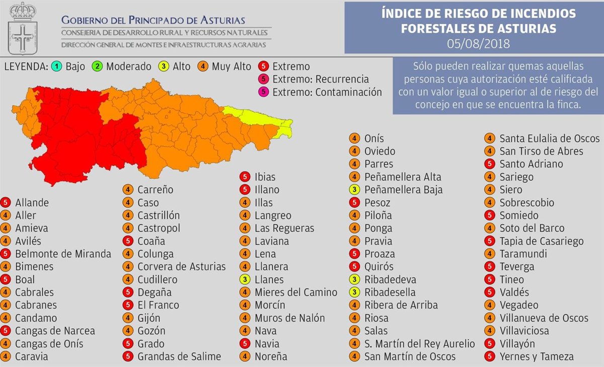 El índice de riesgo de incendios forestales será extremo este domingo, día 5 de agosto, en un total de 23 de los 78 municipios asturianos, según datos del Gobierno asturiano recogidos por Europa Press. La escala de este índice es, de menor a mayor, 'bajo', 'moderado', 'alto', 'muy alto' y 'extremo'.