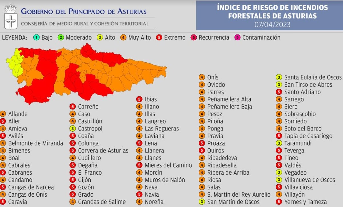 Riesgo de incendio forestal en Asturias para este viernes, 7 de abril de 2023. - GOBIERNO DE ASTURIAS