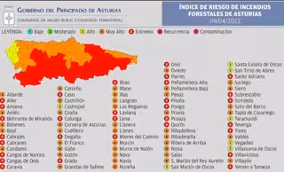 Los concejos con mayor riesgo de sufrir un incendio forestal serán Aller, Amieva, Belmonte de Miranda, Cabrales, Cabranes, Cangas del Narcea, Cangas de Onís, Caravia, Caso, Colunga, Degaña, Grado, Ibias, Laviana, Lena, Mieres, Onís, Parres, Peñamellera Alta, Piloña, Ponga, Proaza, Quirós, Santo Adriano, Sobrescobio, Somiedo, Teverga, Tineo, Villaviciosa y Yernes y Tameza.