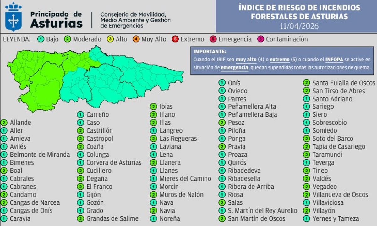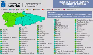 Ningún concejo presenta índices alto, muy alto ni extremo. Se registran niveles de riesgo moderado en 32 municipios y bajo en 46. Estos niveles se calculan en función de las condiciones meteorológicas previstas y de los datos de recurrencia temporal y espacial de incendios forestales.