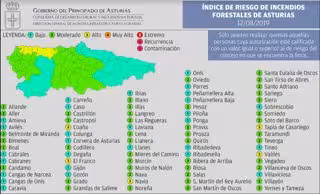 Por otra parte, el riesgo será moderado en Allande, Aller, Belmonte de Miranda, Bimenes, Boal, Candamo, Castrillón, Castropol, Cudillero, Grado, Grandas de Salime, Illano, Illas, Langreo, Las Regueras, Lena, Llanera, Mieres del Camino, Morcín, Muros de Nalón, Nava, Noreña, Oviedo, Pesoz, Pravia, Proaza, Quirós, Ribera de Arriba, Riosa, Salas, San Martín del Rey Aurelio, San Martín de Oscos, Santa Eulalia de Oscos, San Tirso de Abres, Santo Adriano, Sariego, Siero, Somiedo, Soto del Barco, Taramundi, Teverga, Vegadeo, Villanueva de oscos, Villayón y Yernes y Tameza.