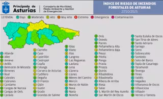 Por su parte, los concejos con riesgo moderado son Aller, Amieva, Cabrales, Cabranes, Cangas del Narcea, Cangas de Onís, Caravia, Colunga, Degaña, Grado, Ibias, Lena, Mieres, Onís, Parres, Peñamellera Alta, Piloña, Ponga, Proaza, Quirós, Santo Adriano, Teverga, Tineo, Villaviciosa y Yernes y Tameza.