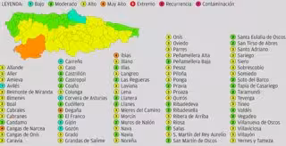 Se trata de los concejos de Cangas del Narcea, Degaña e Ibias. En el resto de los municipios asturianos (75), el índice es menor, siendo 'alto' en zonas interiores de la comunidad, y 'bajo' o 'moderado' en prácticamente toda la costa.