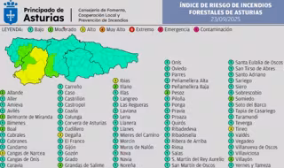 El índice de riesgo de incendios forestales en Asturias se sitúa este lunes en alto en los concejos de Cangas de Narcea, Degaña, Ibias y Tineo, mientras que se mantiene en moderado en Allande, Belmonte de Miranda, Boal, Grandas de Salime, Illano, Pesoz, Somiedo y Villayón. En el resto de la región, el riesgo es bajo.