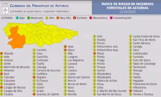 Los concejos que más riesgo tienen de sufrir incendios son Allande, Boal, Cangas del Narcea, Degaña, Grandas de Salime, Ibias, Illano, Pesoz y Villayón. En el resto del territorio asturiano el riesgo es alto.