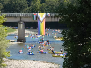 Más de 500 personas han participado en el V Descenso LGTBIQ+ del Sella, en un ambiente festivo, deportivo y reivindicativo. Tras desplegar la bandera del colectivo en el puente de Arriondas sobre el río, comenzó un descenso marcado por el colorido y la diversidad. Es la primera vez que el descenso supera el medio millar de participantes, según destacan desde la organización del evento.
