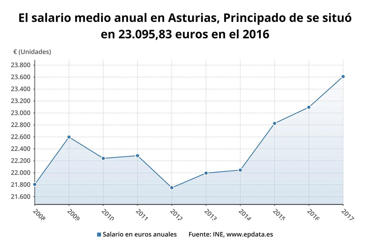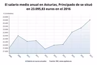 El salario bruto medio anual por persona trabajadora en el Principado de Asturias ha sido de 23.609,67 euros en el año 2017, lo que supone un 2,22% más que el año anterior, según datos difundidos por el Instituto Nacional de Estadística (INE).