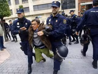 El edil de IU fue uno de los concentrados que se sentaron en la carretera en el cruce de General Elorza con avenida de Pumarín, y a los que los agentes tuvieron que levantar de la calzada con fuerza.