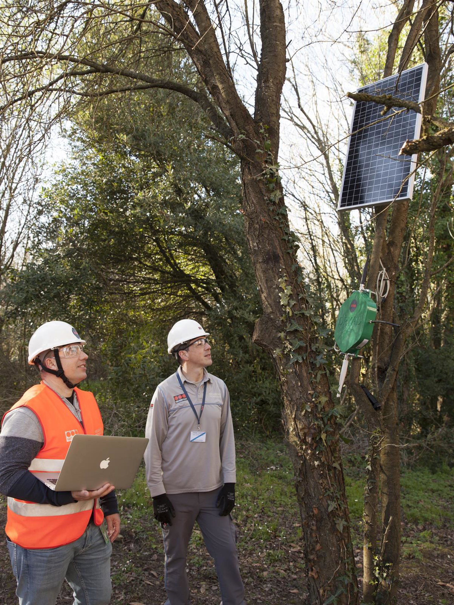 Los sensores, alimentados por placas solares, se instalan en los propios árboles utilizando técnicas respetuosas con la vegetación y trabajan en red, conectándose con un dispositivo de enlace que centraliza las señales. Todos los datos recibidos se procesan mediante analítica basada en la nube.