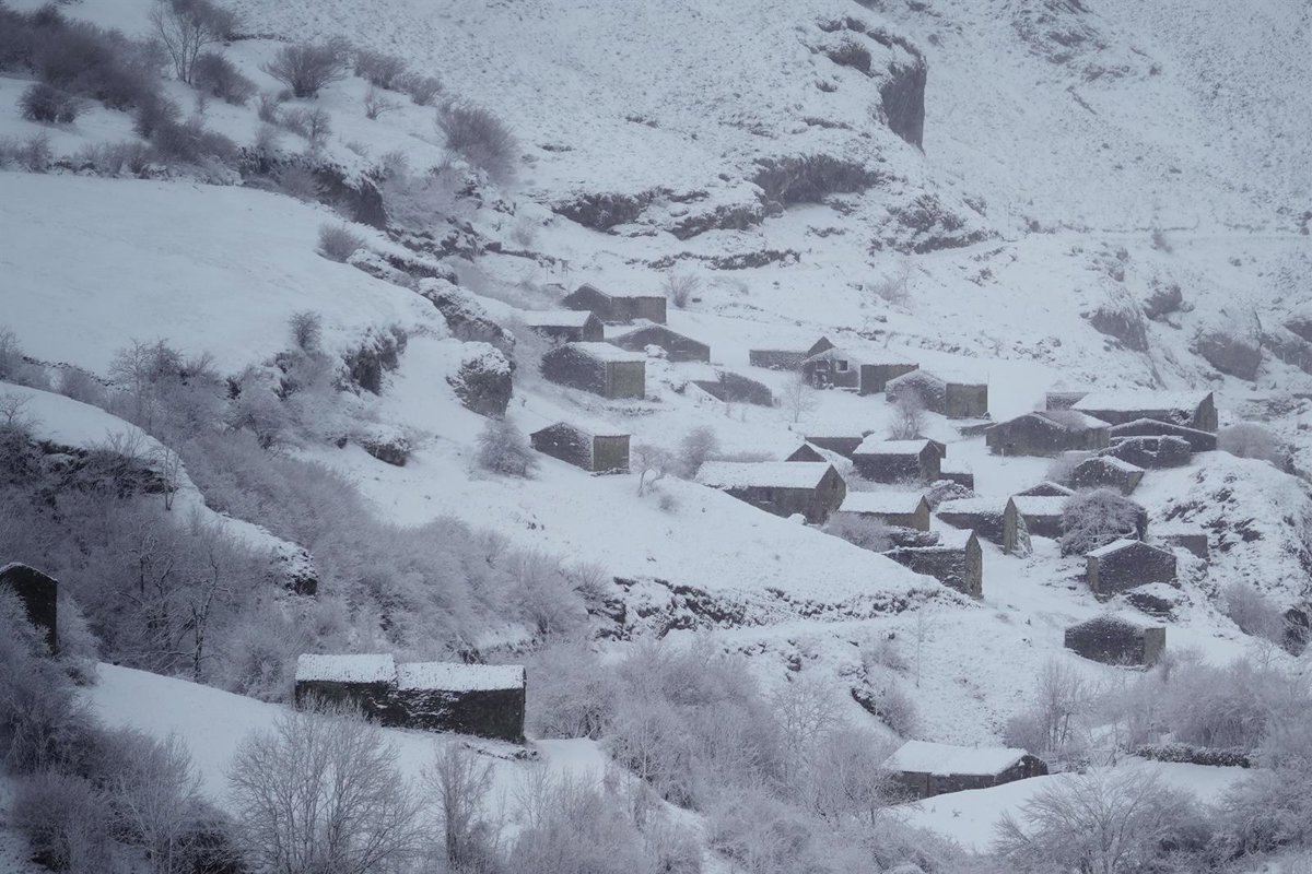 Cabañas cubiertas de nieve o 'Invernales del Teju', a 17 de enero de 2023, en Cabrales, Asturias (España). Los vehículos pesados tienen restringido el paso en el Alto de Estazadas (Cabrales) como consecuencia de la nieve. El temporal dejará en Asturias - Xuan Cueto - Europa Press