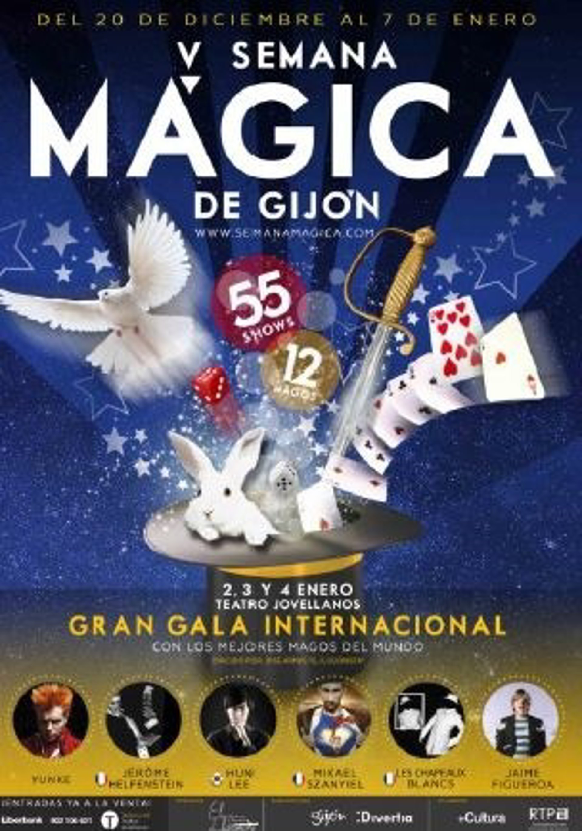 El próximo sábado 2 de enero, a las 21:00 horas, se celebrará en el Teatro Jovellanos de Gijón la primera de las cuatro galas internacionales para clausurar la V Semana Mágica de Gijón. La función estará presentada por el mago y actor Jaime Figueroa y en ella participará el ganador del premio mundial de grandes ilusiones y televisivo, Yunke.
