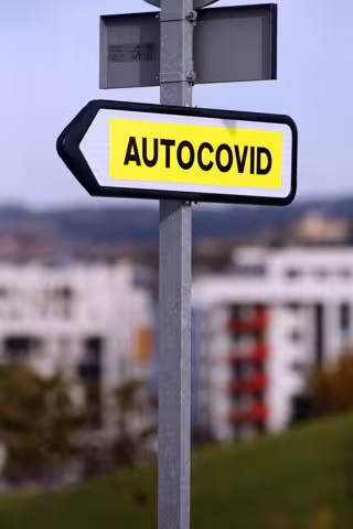 Cartel indicativo del "Autocovid" del Hospital Universitario Central de Asturias (HUCA). - Jorge Peteiro - Europa Press