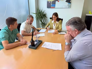 Fernando Hernández, CEO De Sputnik; Ángel García, Alcalde De Siero; Marina Navarro, Notaria, Y Hermenegildo Felipe Fanjul, Secretario Municipal. - AYUNTAMIENTO DE SIERO