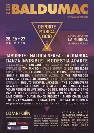 El Festival Baldumac será los días 25, 26 y 27 de mayo en el recinto de La Morgal, en Llanera, un macro centro de música, de actividades culturales, deportivas, gastronómicas y de ocio. El cartel incluye a grupos como Taburete, Danza Invisible, Maldita Nerea, Vicky Larraz, Tam Tam Go, Rebeldes, Modestia Aparte y El Norte, entre otros.