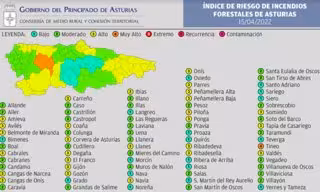 En riesgo 'alto' estarán los municipios de Amieva, Avilés, Belmonte de miranda, Cabrales, Cangas del Narcea, Cangas de Onís, Carreño, Coaña, Corvera, Degaña, El Franco, Gijón, Gozón, Ibias, Llanes, Navia, Onís, Piloña, Ponga, Rivadedeva, Ribadesella, Somiedo, Tapia de Casariego y Valdés. El resto de Asturias presentará riesgo 'bajo' o 'moderado'.